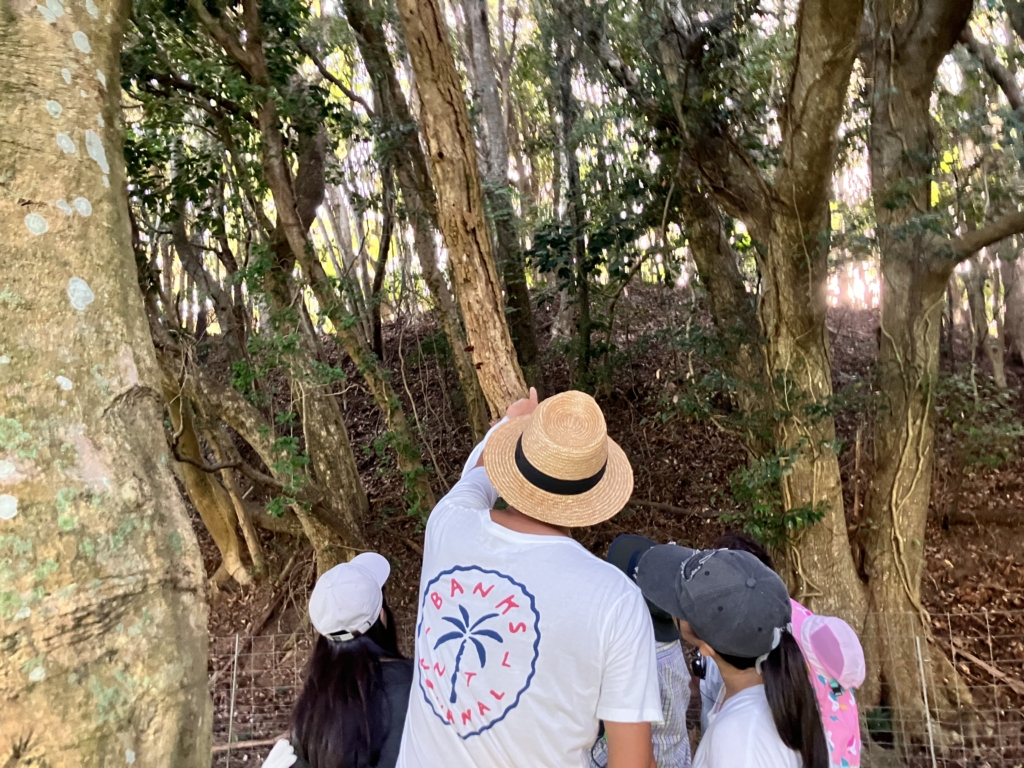 当日は16時に集合。自然観察会の概要や、注意事項を受けてからコース内を歩き始めました。潮風が吹き抜ける勝浦の丘陵地は、夏でも暑くなりにくく心地よい涼しさ。指導員さんは、そんな勝浦の地形についてのお話や、照葉樹に関する説明もしてくださいました。