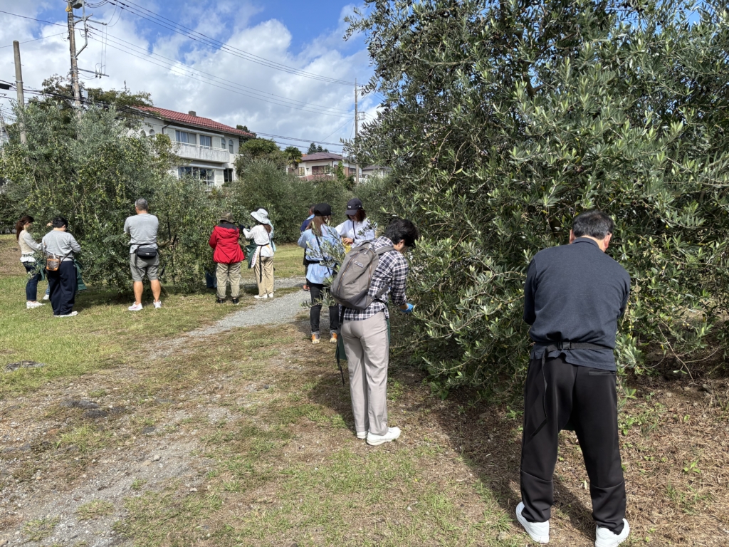 2025年10月18日(土)、伊豆高原にあるオリーブ搾油場(静岡県伊東市)で、株式会社ウィズオリーブ主催による「第3回伊豆オリーブ収穫祭」が開催されました。オリーブの実を摘み、選果をしたり、搾りたてのオリーブオイルをテイスティングしたり。触れて・香って・味わって、伊豆産オリーブの魅力を楽しみました。前日までの雨が嘘のように青空が広がったこの日、ホテルハーヴェスト伊東からは、ご宿泊のお客様9名とスタッフ2名が参加。伊豆高原の自然に包まれながら、みなさんと一緒にオリーブの収穫を祝いました。